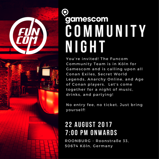 The Funcom community team is travelling to Cologne in two weeks to attend Gamescom, and we would like all our fans who are in town to join us for what we hope will be a great party.