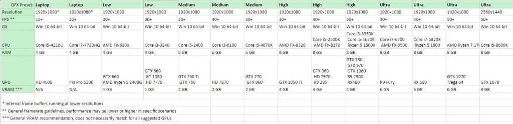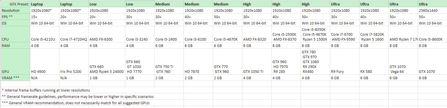 In the table below, we have summarized our findings from the compatibility tests. The results are relatively conservative and should allow you to have a good experience if you have similar configurations. Obviously, if you’re playing in a stressful scenario with lots of players and buildings, performance will be different. If your game performance is severely different from our estimates in the table below, please get in touch with one of our community managers, as there may be some compatibility issues that we’re not aware of.