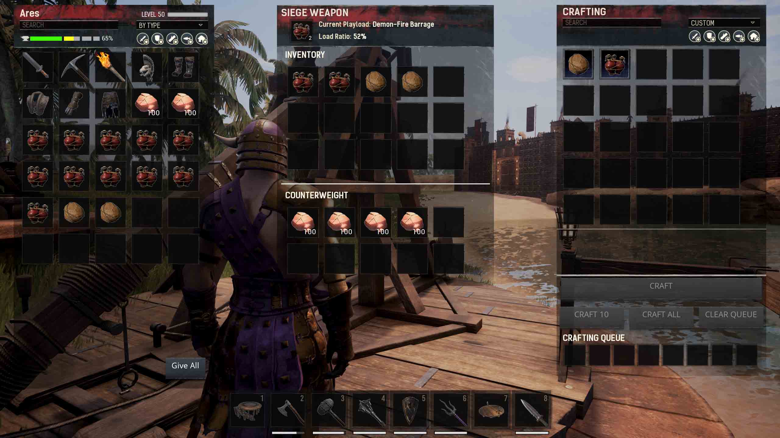 Das Tribok zu meistern, ist ein eigenes kleines Spiel. Um es aufzustellen, müsst ihr zunächst ein Belagerungsfundament platzieren und dann zwei Upgrades durchführen, bis die fertige Kriegsmaschine vor euch steht. Um mit dem Tribok zu zielen, drückt ihr gegen die Seiten, bis es in die gewünschte Richtung zeigt. Die Distanz eures Schusses wird durch das benutzte Gegengewicht bestimmt. Je mehr Gewicht ihr hinzufügt, desto weiter könnt ihr schießen, bis zur maximalen Reichweite der Kriegsmaschine.