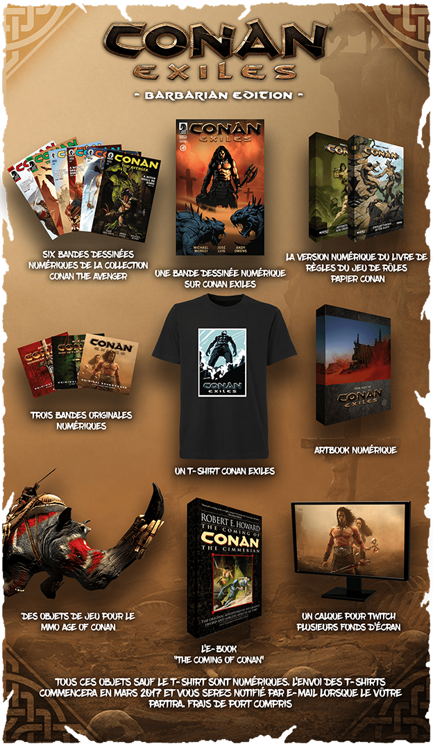 Funcom a également le plaisir d’annoncer la sortie de l’édition Barbarian de Conan Exiles ! Cette édition spéciale permet de découvrir au mieux l’univers de Conan. Elle comprend :