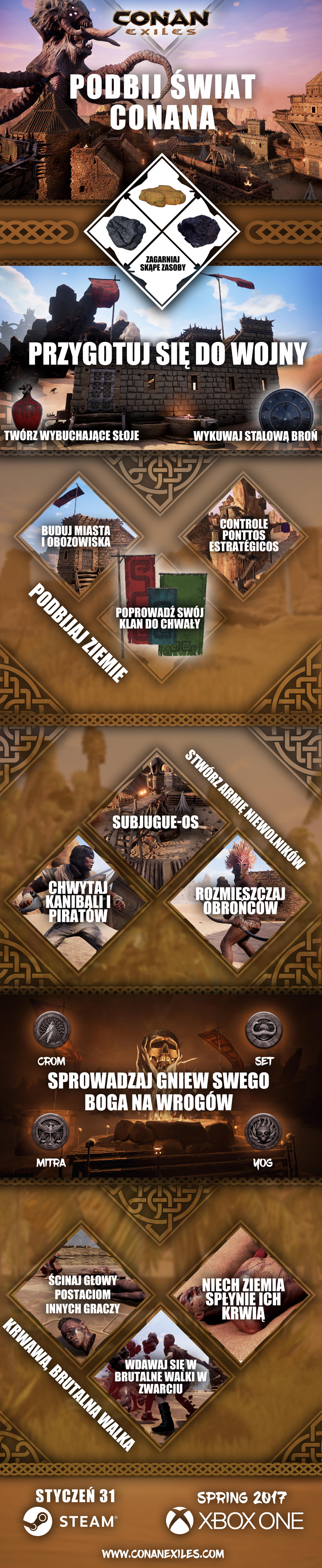 Odniesienie miażdżącego zwycięstwa nie będzie w Conan Exiles łatwe. Świat gry jest pełen niebezpiecznych istot, wrogo nastawionych frakcji i agresywnych graczy. Pokonacie ich, wykorzystując odpowiednio swoje umiejętności, dobierając właściwą strategię, wykazując się wytrwałością i nigdy nie okazując litości.