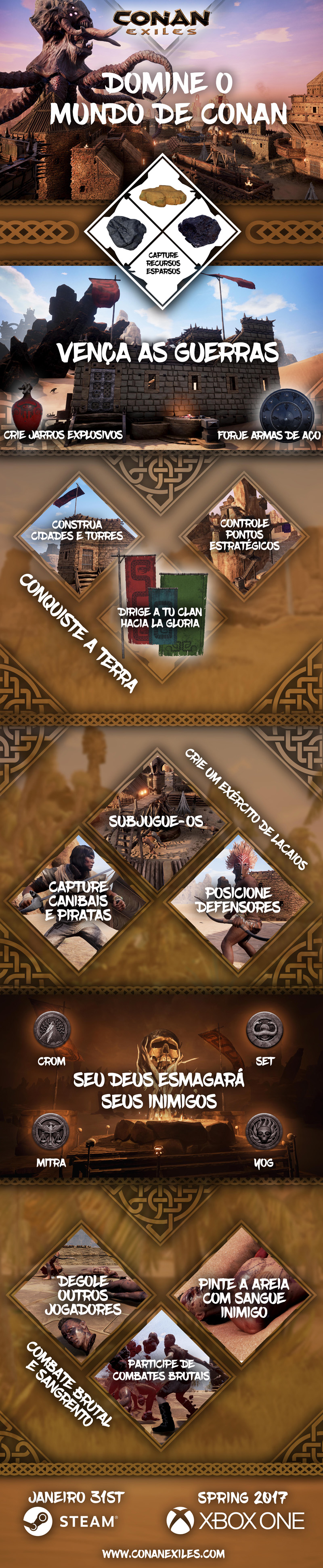 Não será fácil esmagar seus inimigos no Conan Exiles. O mundo está cheio de criaturas perigosas, facções hostis e jogadores agressivos. Para dominá-lo você precisará ter habilidade, estratégia, perseverança e, acima de tudo, precisará ser implacável.