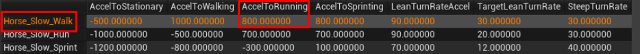 My Current Speed goes from 0 to 1 which switches Current Movement Mode to Walk , and, as a result, mount will be referring to AccelToRun value at the Horse_Fast_Walk row for acceleration: