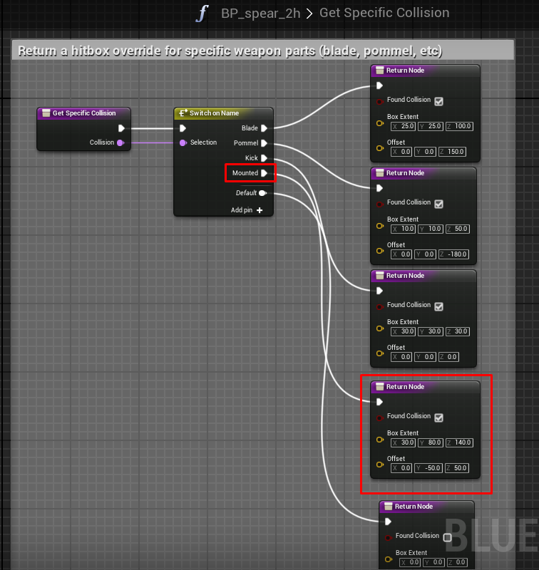 In order to retrieve the correct value a new entry needs to be added to Switch_On_Name box called “ Mounted ” and a return node should have FoundCollision box checked and collision valued filled.