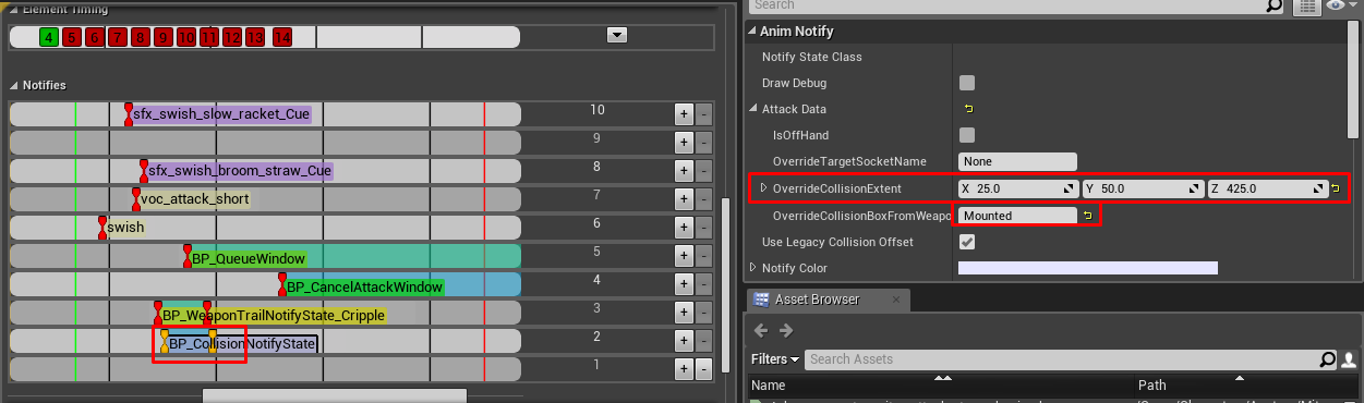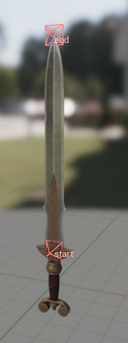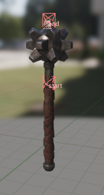 If we look at the weapon meshes above it’s easy to see why: the sockets that collision boxes depend on are placed differently. To solve this issue we are adding the offset values per weapon type and only utilize it when the weapon is used in a context of a mount. Having these values properly set up will allow us to use the same collision values inside animation montage for all 3 weapon types without having to readjust each one individually.