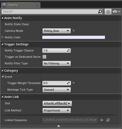 Rider animations for locomotion are defined by adding BP_LaunchRidingAnimation as a notify on the mount’s locomotion animations so that they can be synced.