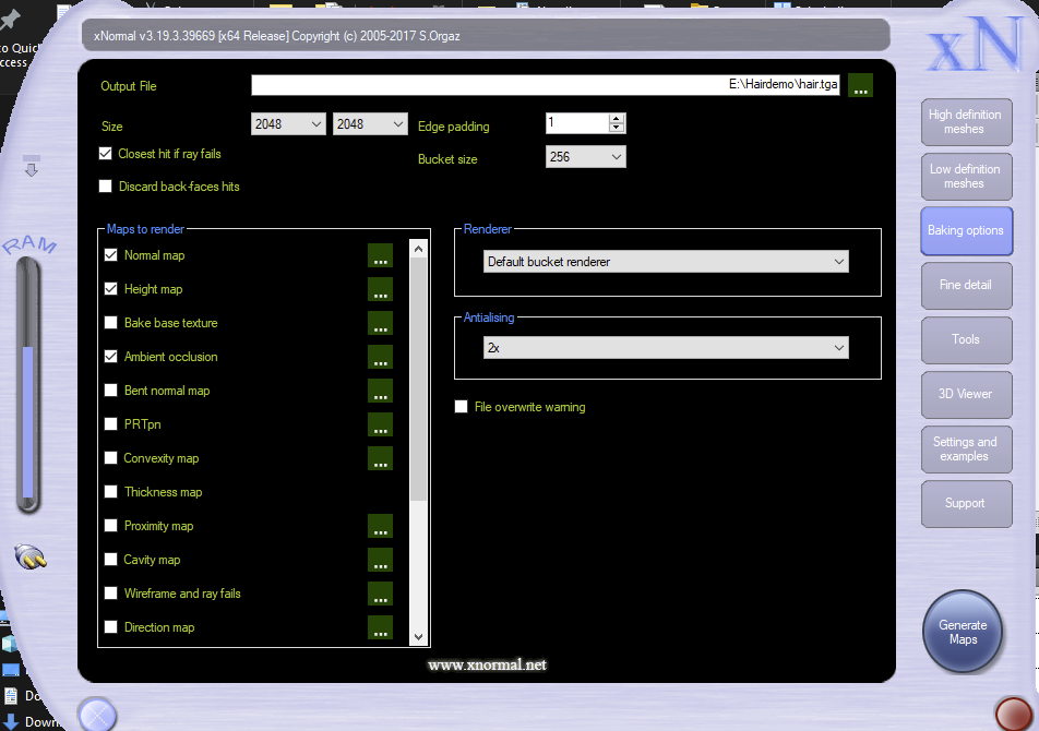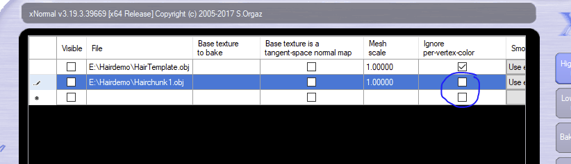 Merge all your hair meshes together and export them as OBJ (naming conventions don’t matter here). Set your hair bake plane as Lowpoly in xNormal and the hair meshes as Highpoly.