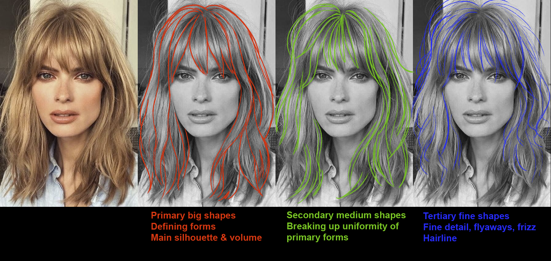 Before you start creating your hair textures, it’s important to get very familiar with looking at real hair reference and reading the necessary information from it. Analyzing photos of real hair helps you break down what you need to achieve that texture, length and cut.