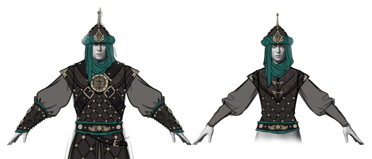 The dying restrictions also affects things like dirt, rust or corrosion, that normally will just take the color of whichever surface it’s on top of. In the case of the Argossean armors we ended up dedicating a color layer specifically for the copper corrosion (the turquoise parts of the metal shown below), so it is possible, just make sure to keep it in mind when making the design.
