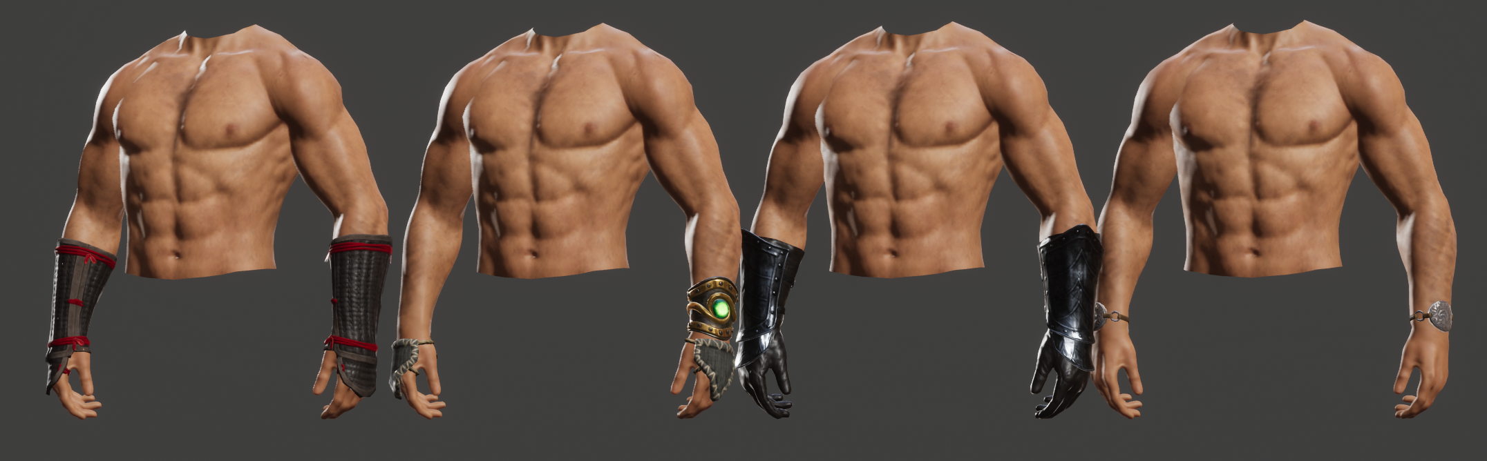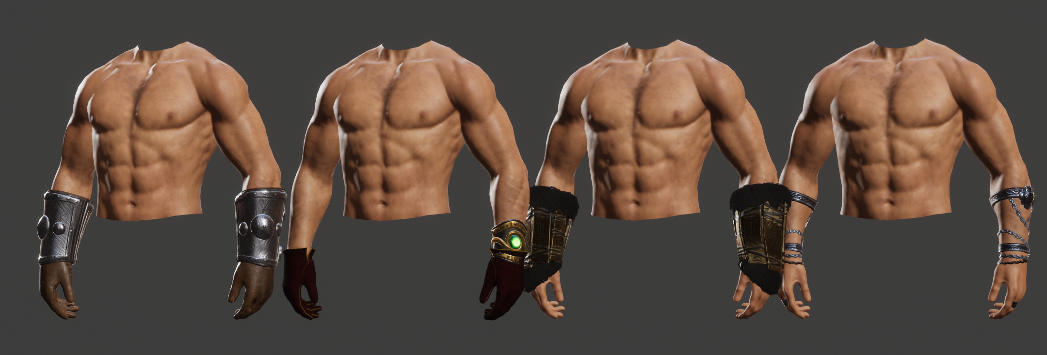 Hand pieces can either stop below or at the seam between hands and forearms, or it HAS to extend up to the seam between the forearms and top, this is in order to work with the tucked mesh system in Conan Exiles. Leaving any parts below the hands and/or forearms seam as bare skin is totally fine, as long as the forearms seam is covered.