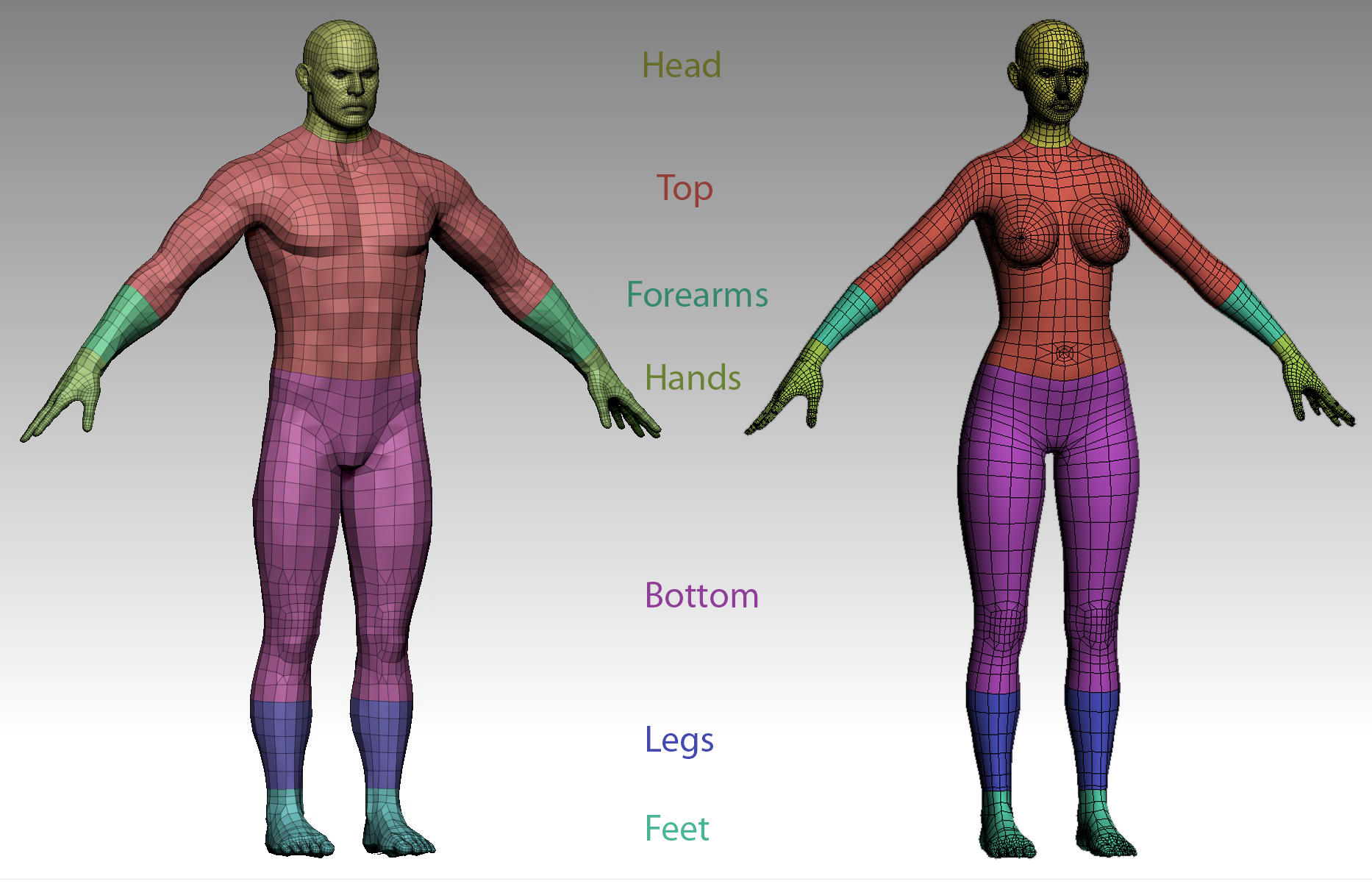 Top pieces can extend up to the head seam, but should not go much higher up the neck. Top pieces can extend all the way down to the wrist area, right past the hands seam. Top pieces should not extend lover than the border between top and bottom.