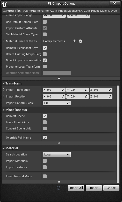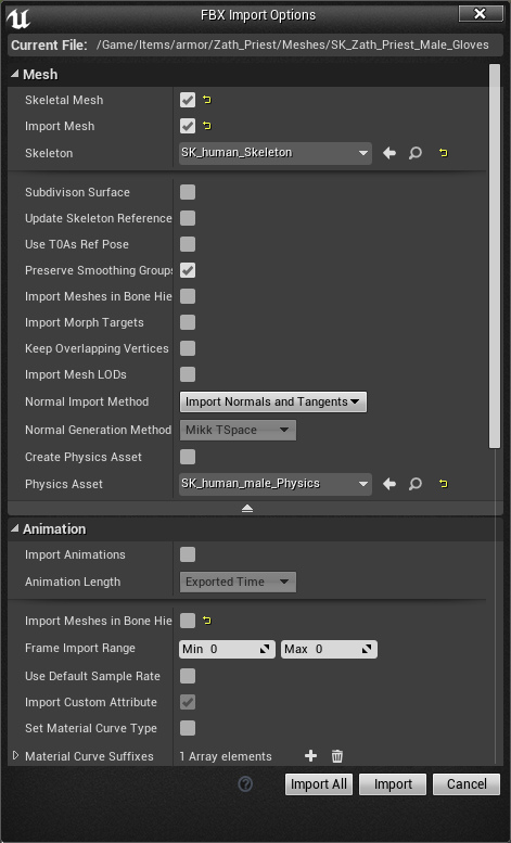 When importing the FBX Import Options will open. In this window you need to make sure that the following options are set.