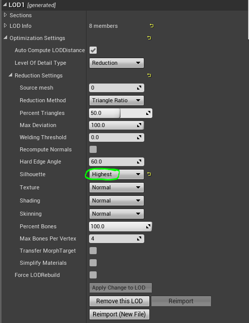 Open the mesh and locate LOD Settings → Number of LODs, slide it up to 4 and press Apply Changes. Under each LOD (LOD1, LOD2 and LOD3) go to Optimization Settings → Reduction Settings → Silhouette and set it to Highest, then press Apply Changes to LOD. This is to make sure the armor piece is easily distinguished by its shape, even at a distance.