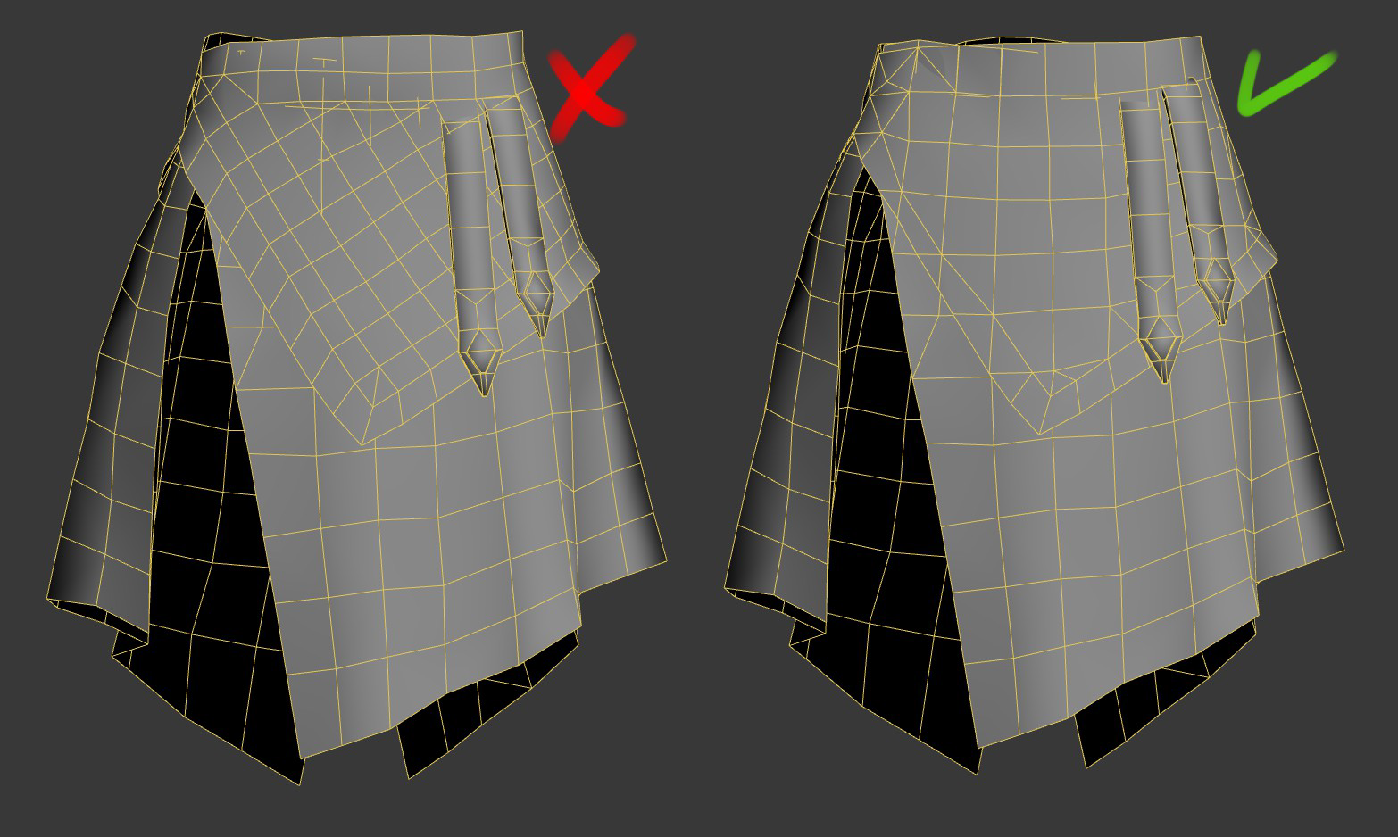 The model on the left does not need a separate tuck mesh, as there is nothing extending past the leg