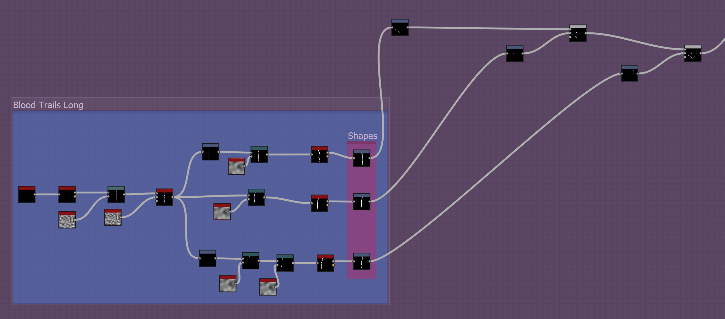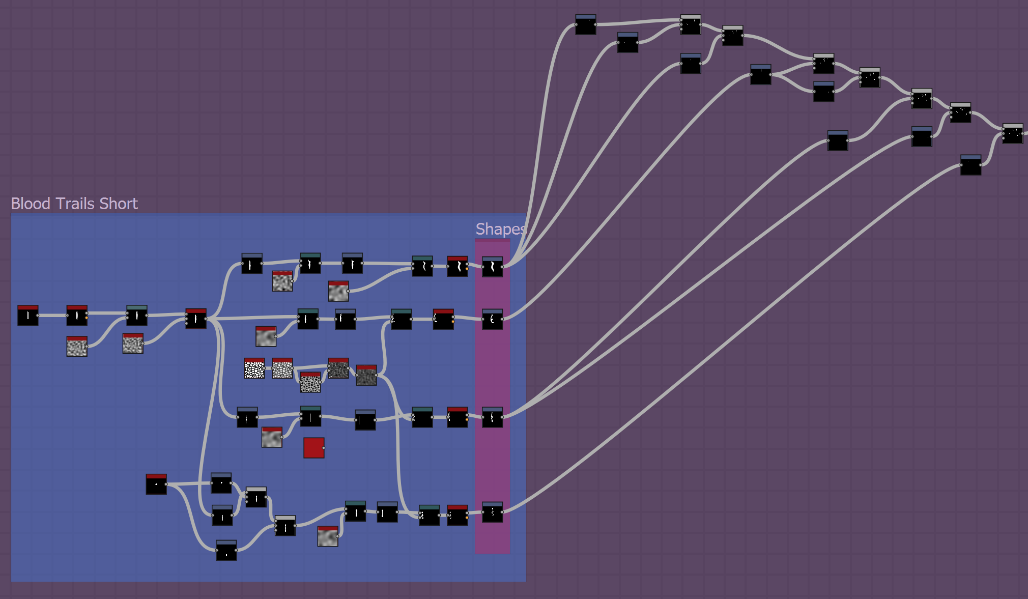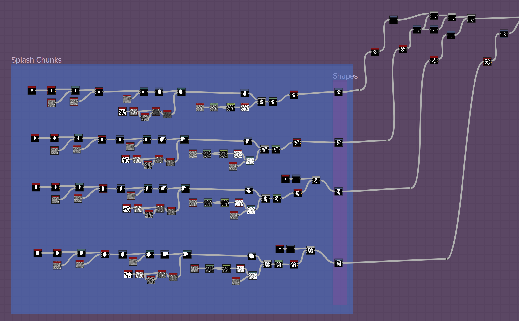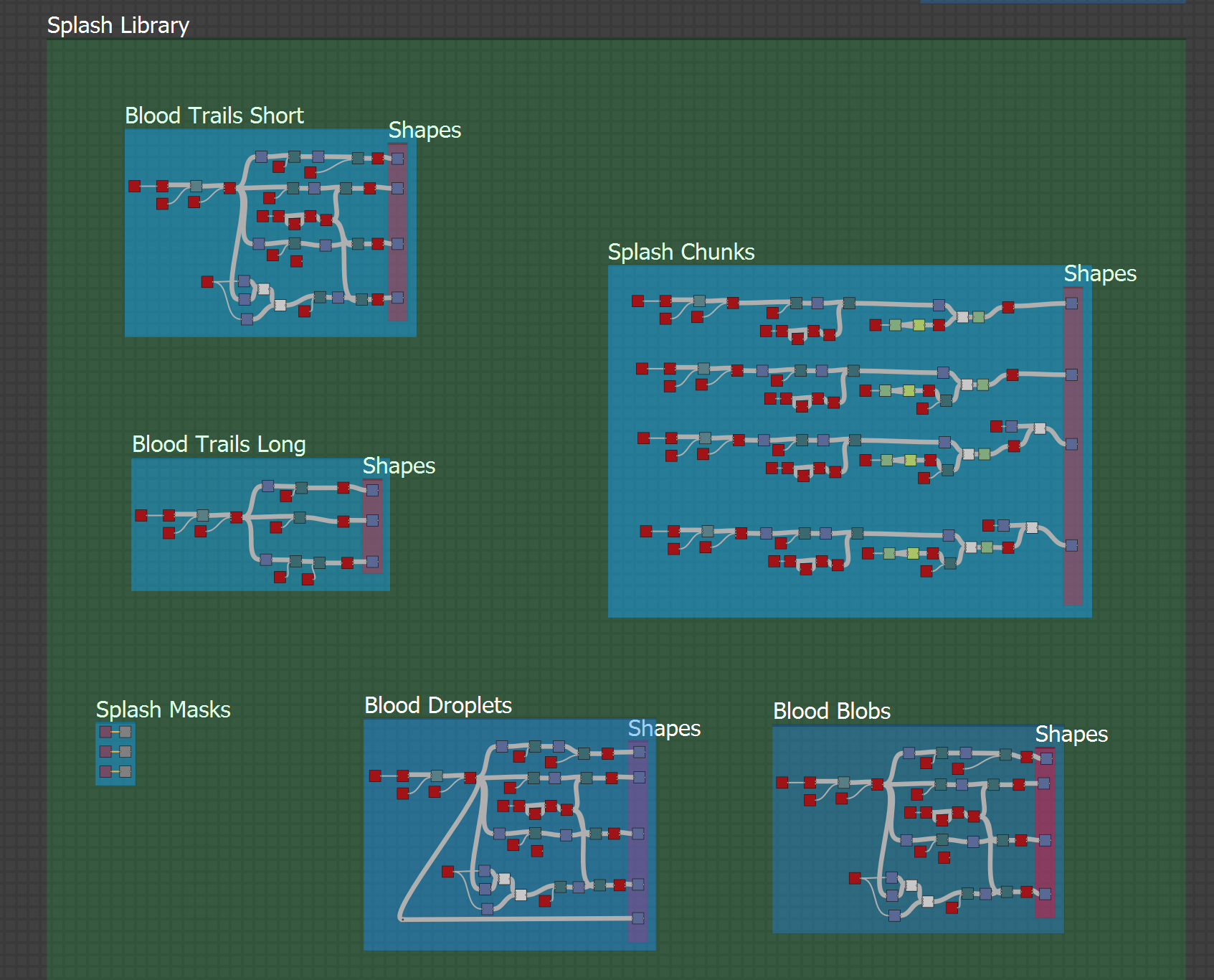 The Blood Splash has multiple elements incorporated that can be manually moved to account for art direction. The first section is the Splash Chunks . There are 4 chunk patterns that can be changed by manipulating nodes to the left of the “Shapes” nodes. The Chunks can be moved and scaled in the final splash via the nodes to the right of the “Shapes” nodes.