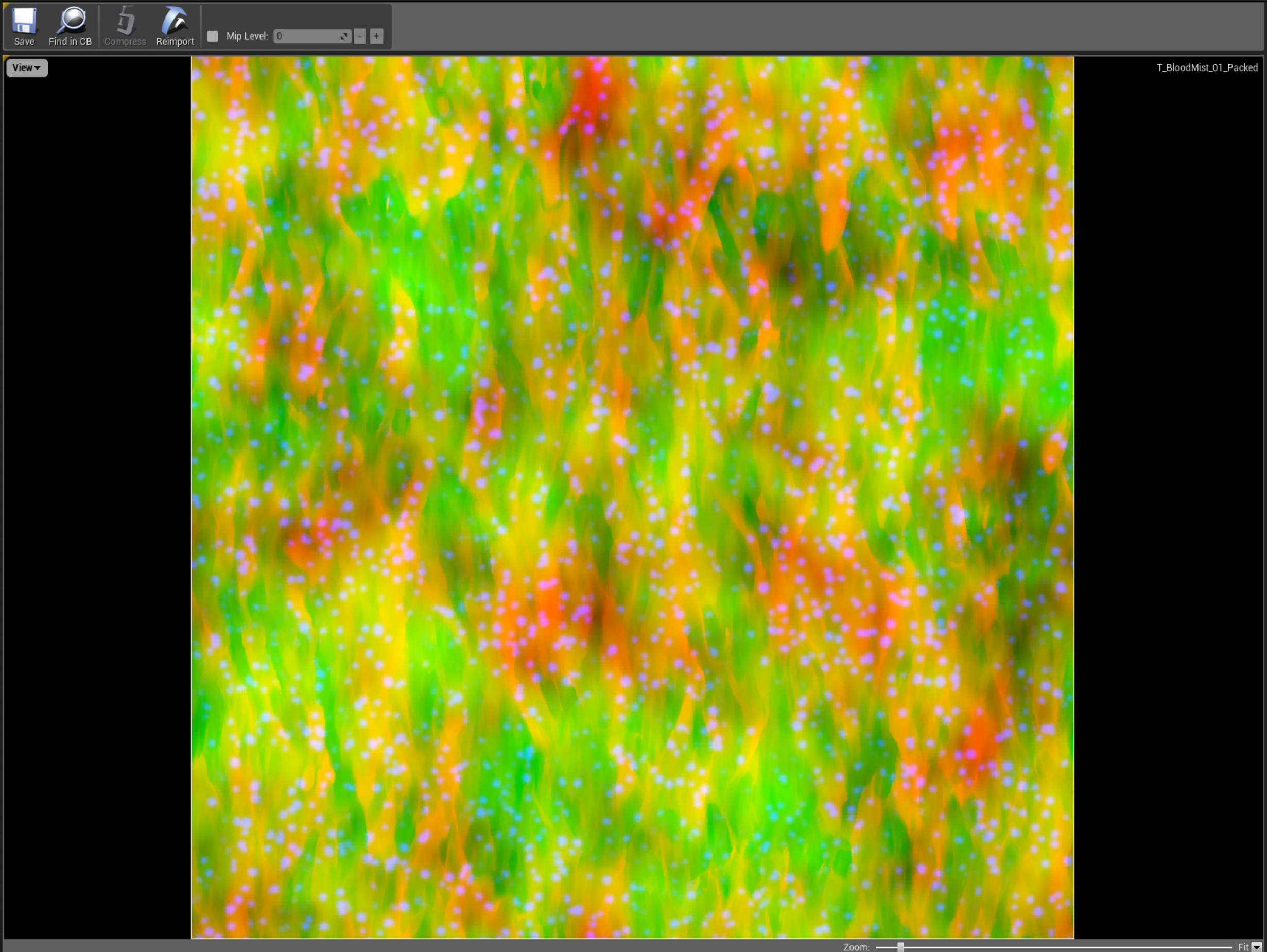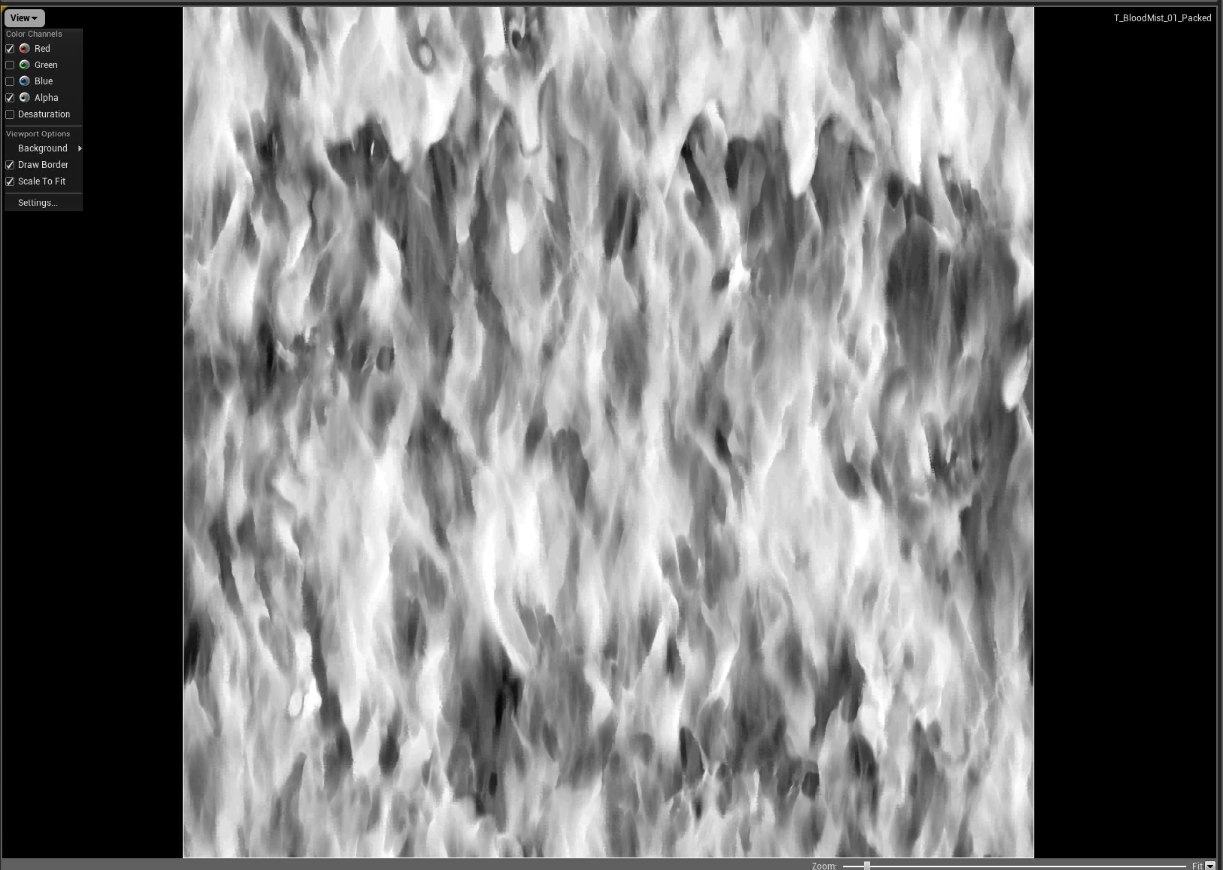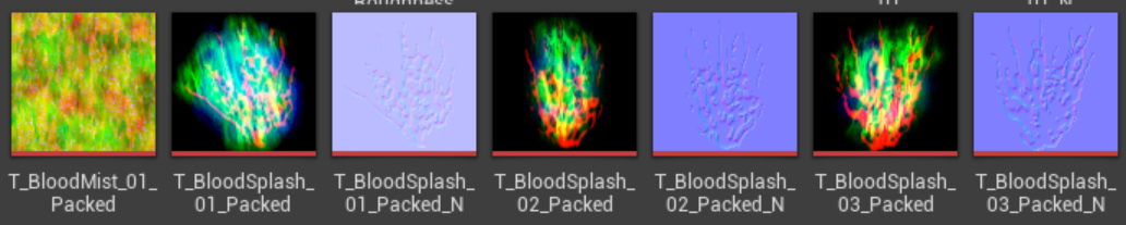 Overall there are 3 types of textures created for the blood system. There is a packed BLOOD MIST/DROPLET texture, a packed BLOOD SPLASH/SPRAY texture and a BLOOD SPLASH NORMAL map for each blood splash that sits in the red channel of the packed BLOOD SPLASH/SPRAY texture.
