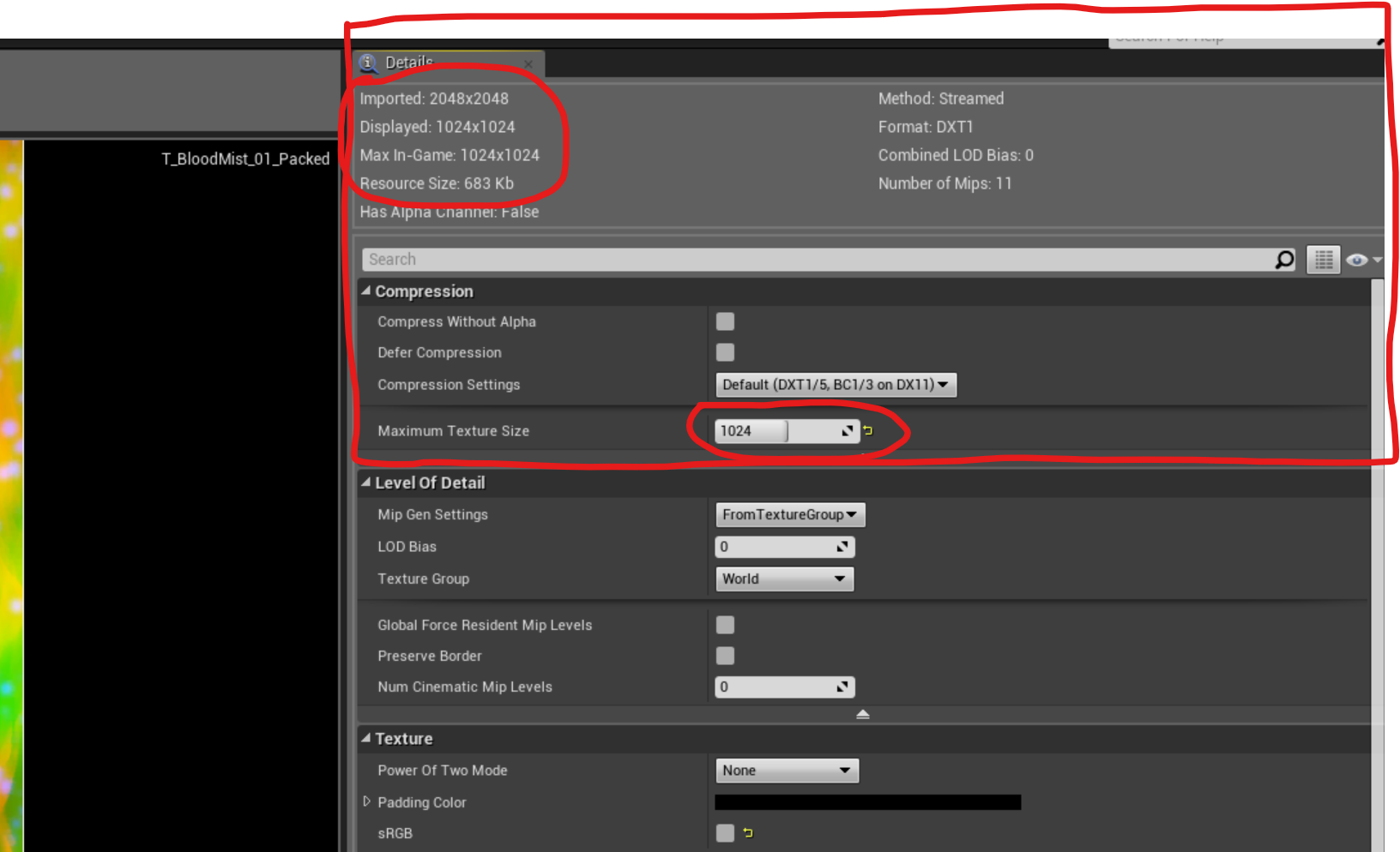 These textures can be brought in at 2048x2048 but need to be scaled down to 1024x1024 in the Texture window to help reduce memory cost. This should bring them down to below 690Kb. The normal maps can be reduced further to around 512x512. This will help save on memory during particle system spawns. Texture resolution can be lowered further if necessary, but be aware that it will change it for all materials that use that texture.
