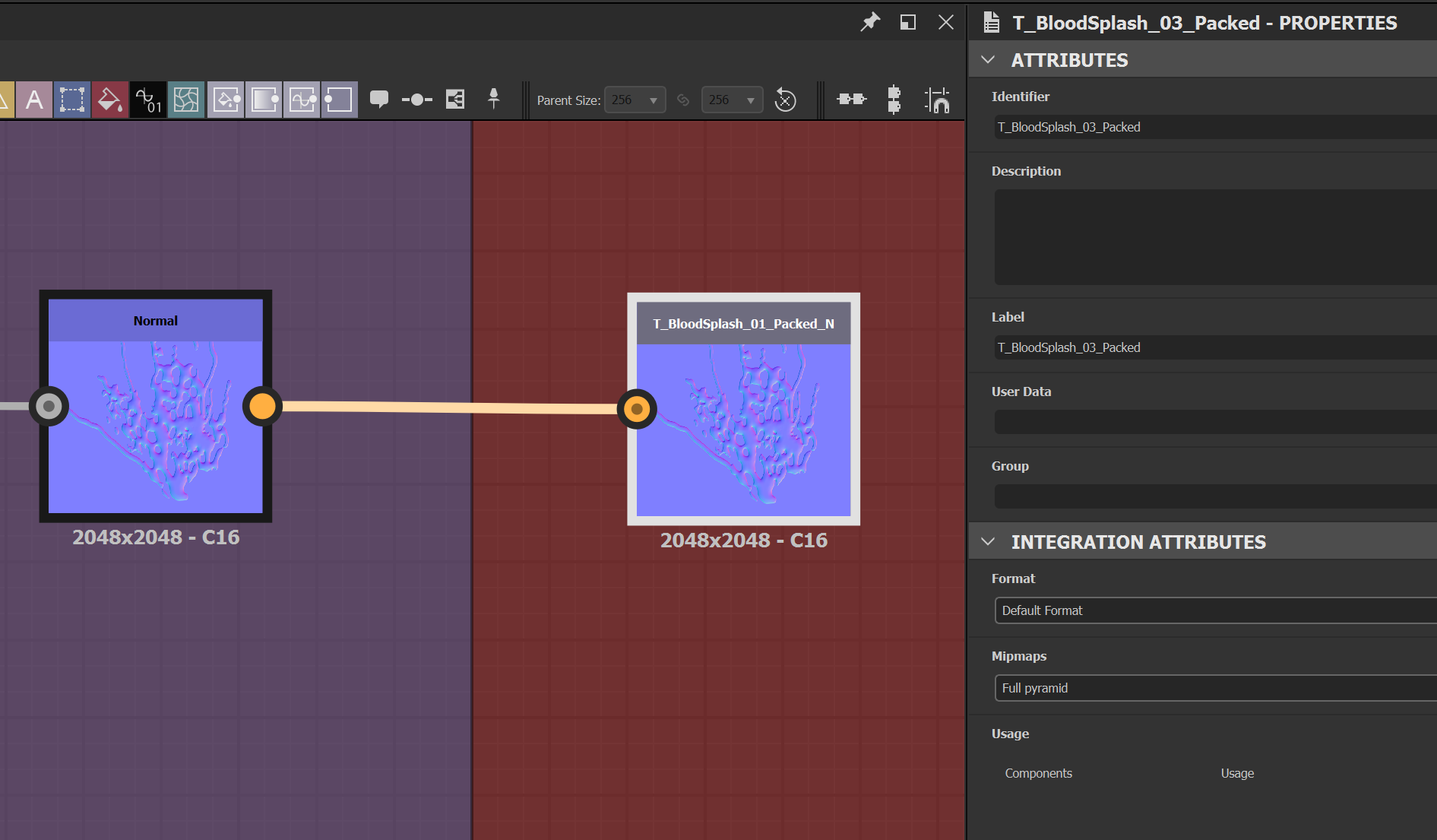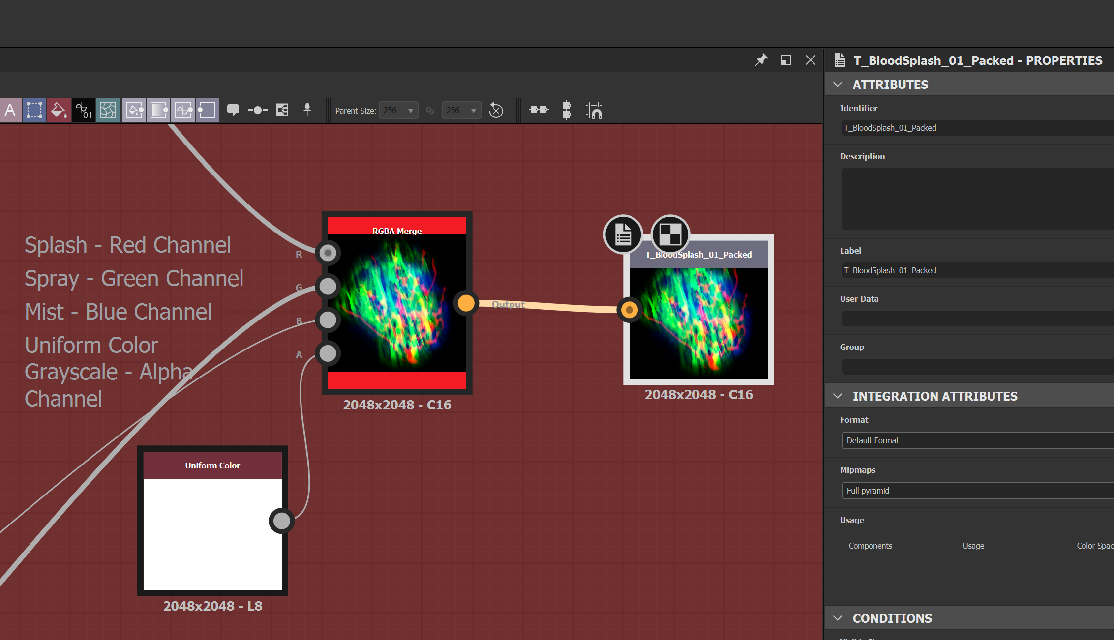 The RGBA Merge node should be connected as indicated in the following image and connected to an Output node. The Blood Mist Base/Spray fills the Red Channel , the Mist fills the Green Channel , the Droplets fill the Blue channel and a Uniform Color Grayscale (White) Fills the Alpha channel . Since a packed texture is being used the suffix “Packed” should be applied to the Texture name.