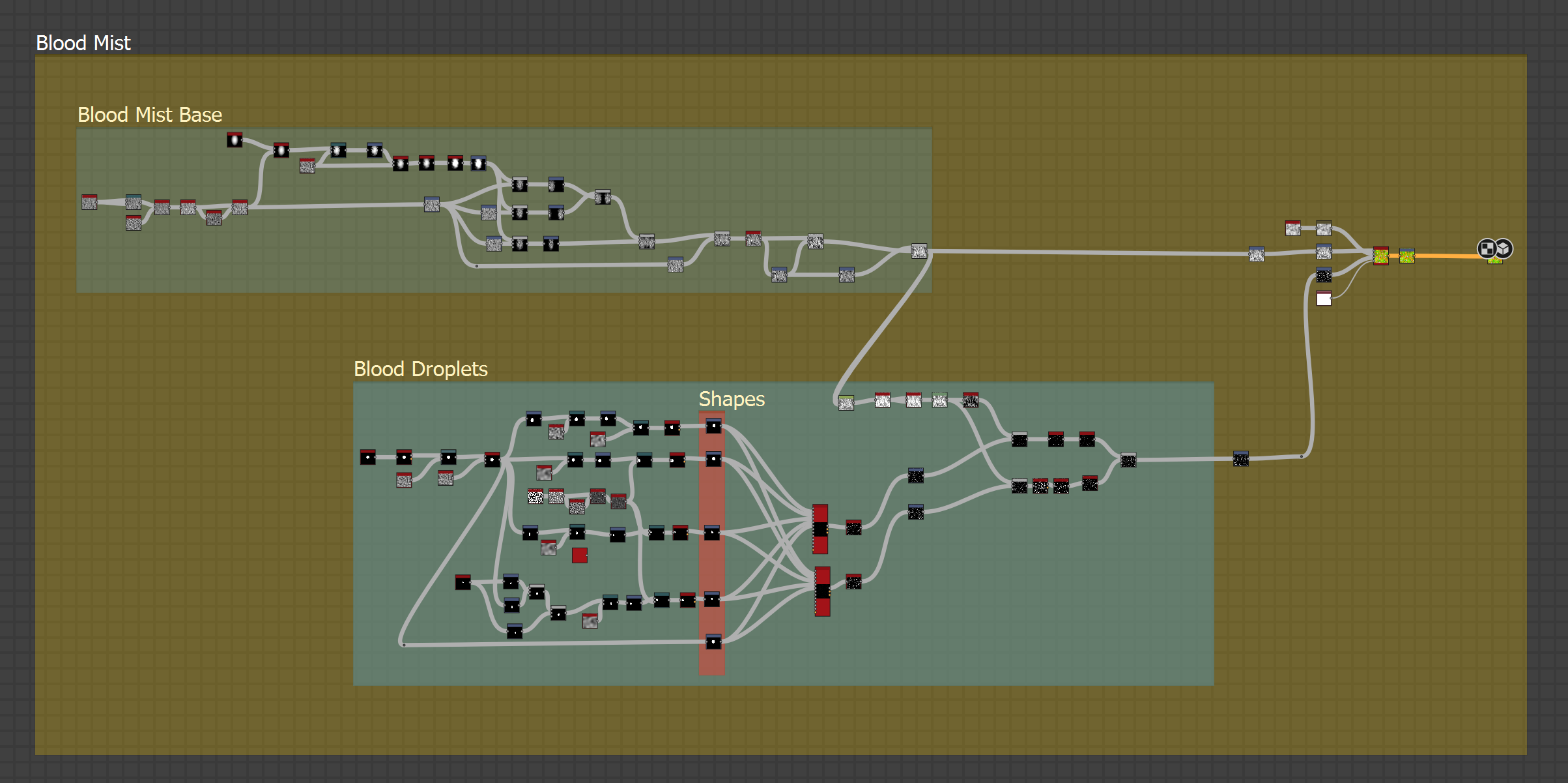 The Blood mist pipeline is composed of 3 elements, the Mist Base/Spray , Mist , and Droplets . The Spray and Mist in this pipeline differ from the Spray and Mist used in the Blood Splash Pipeline as they are used for different effects. (See BHS - Material Workflow ).
