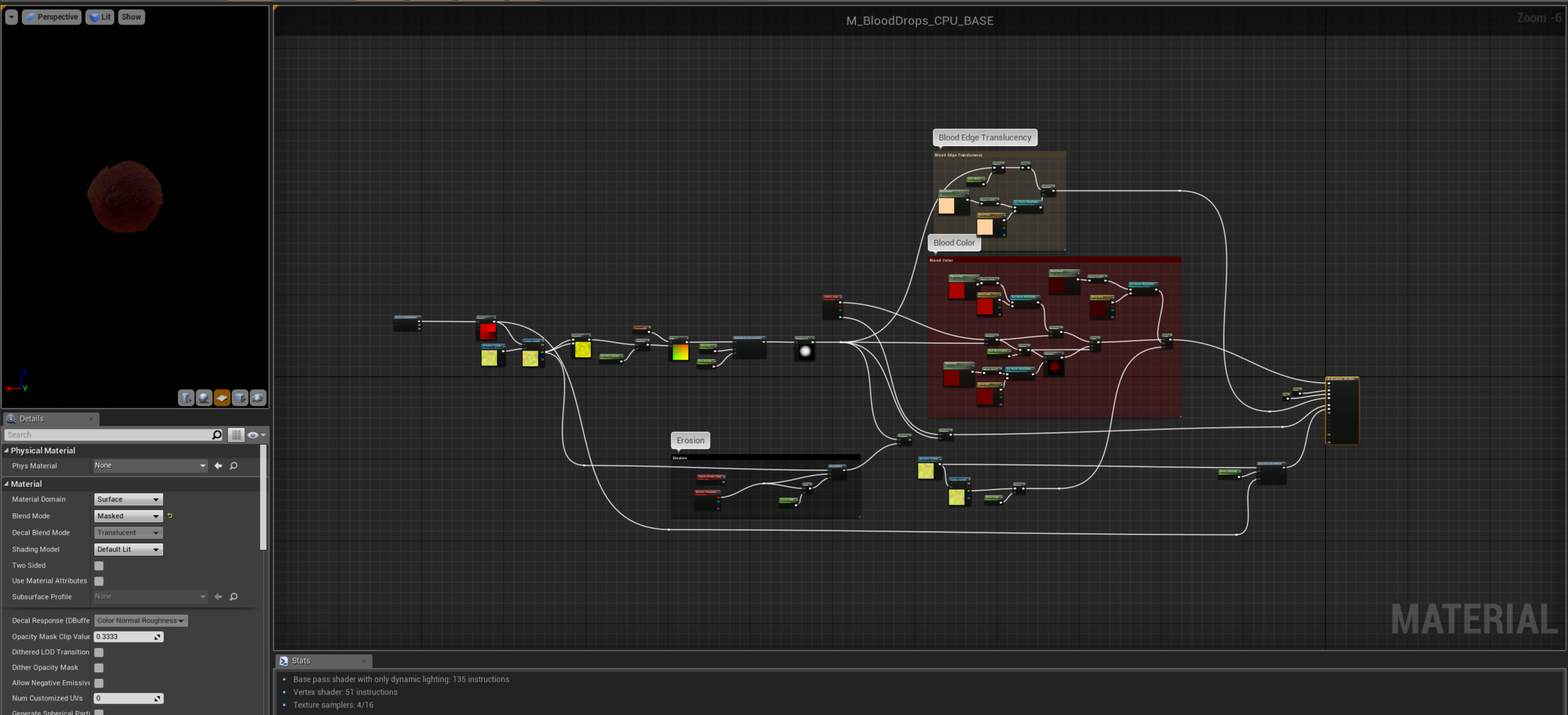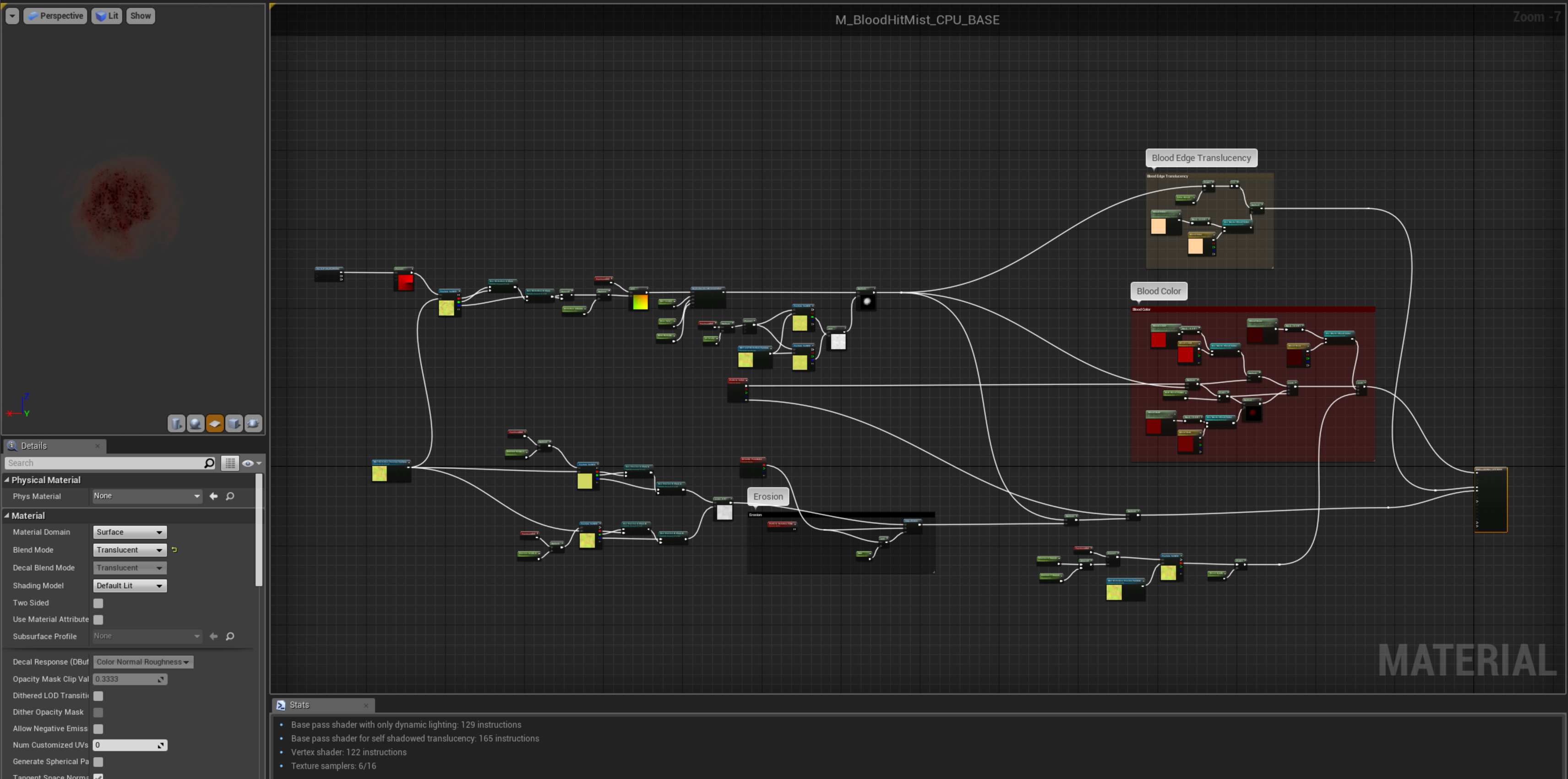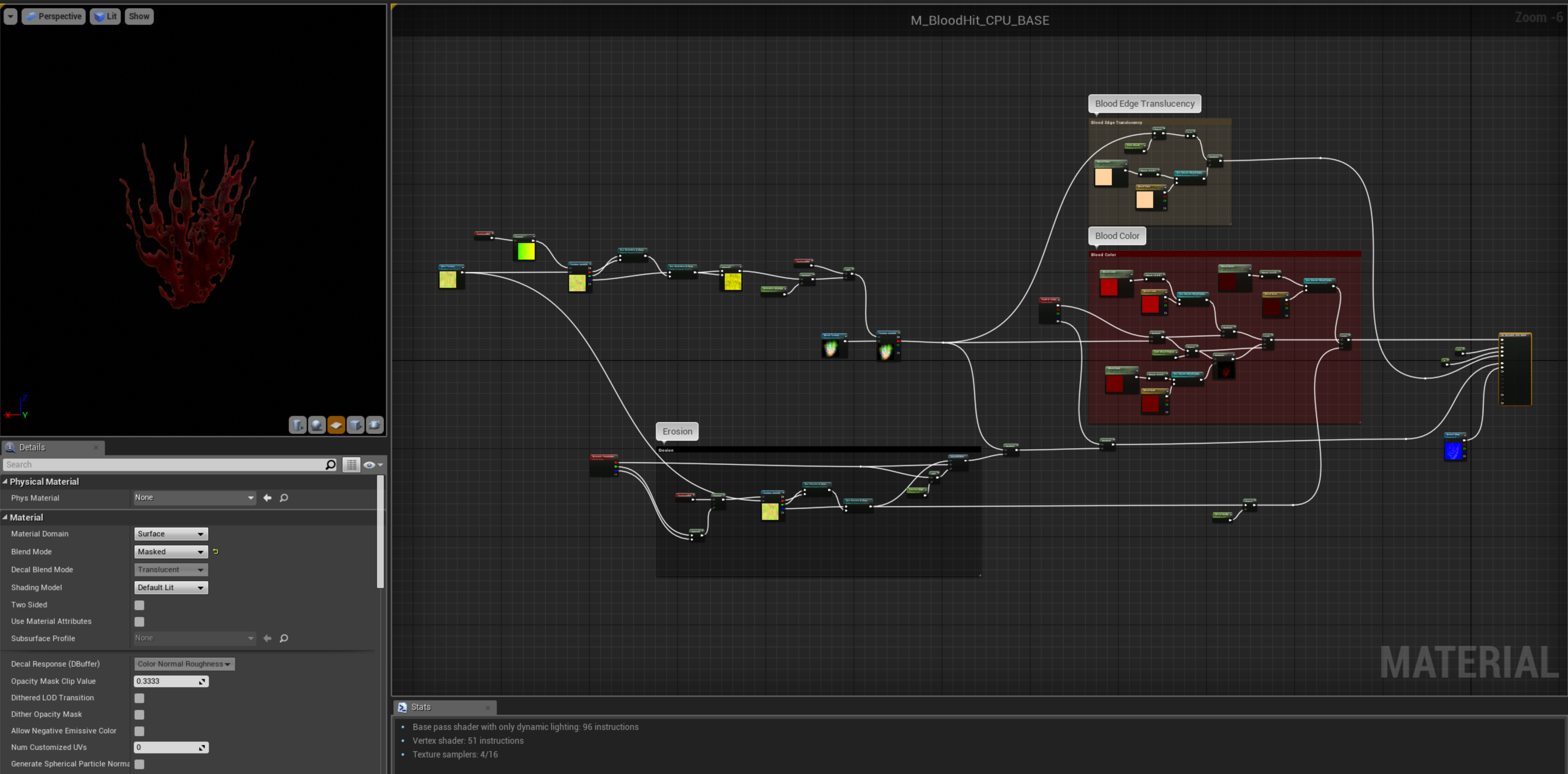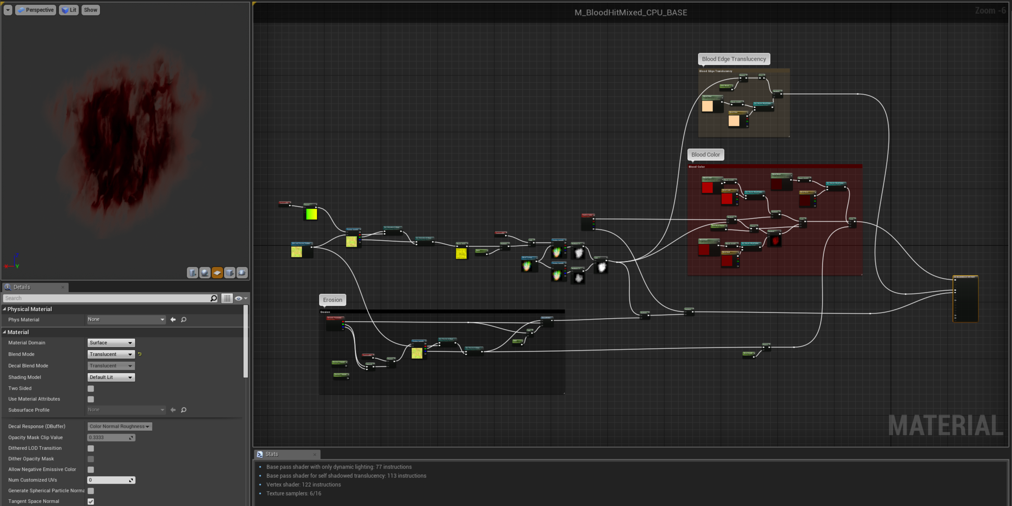 You may notice that only the Red Channel of the MI_BloodHit_CPU_03 material is being used. The same texture is used in MI_BloodHitMixed_CPU_01 and uses the Green and Blue channels. This also helps save on texture memory.