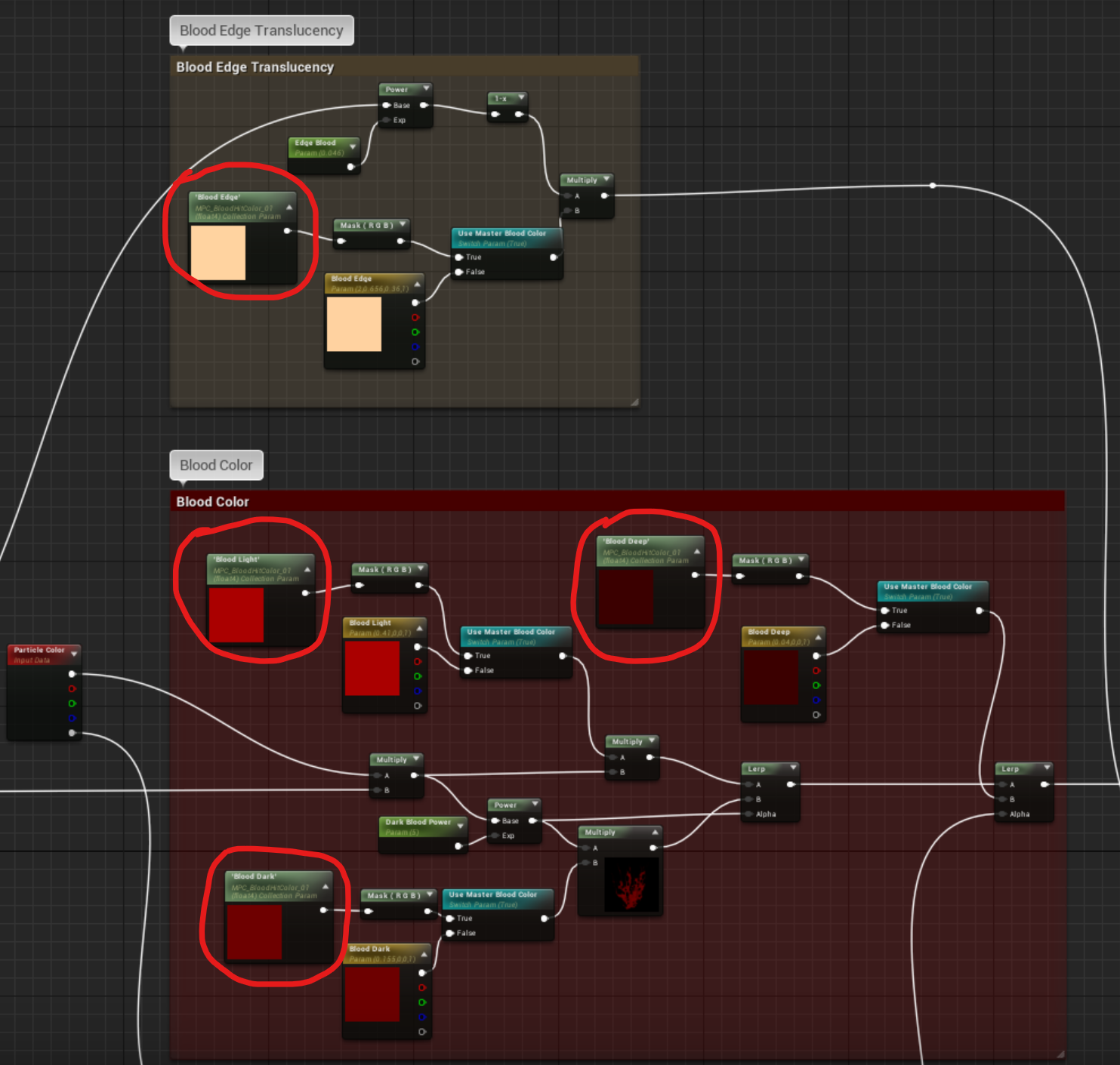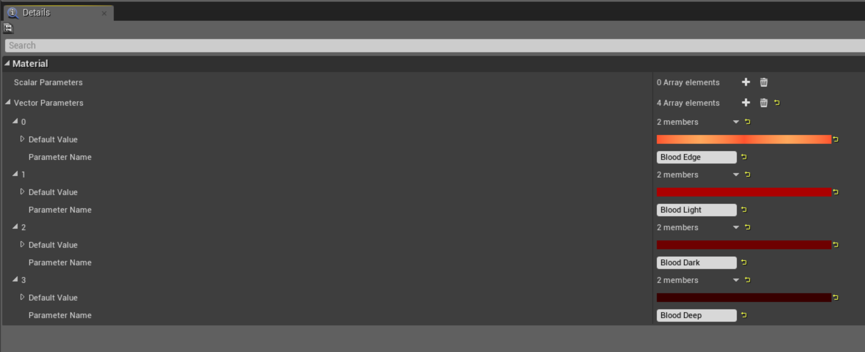 The Universal blood colors are defined here and should only be changed if the global look of the blood needs to change. DO NOT change these values for stylized blood colors. Those should be defined in individual Material Instances or in a NEW MPC that has been applied to new materials.