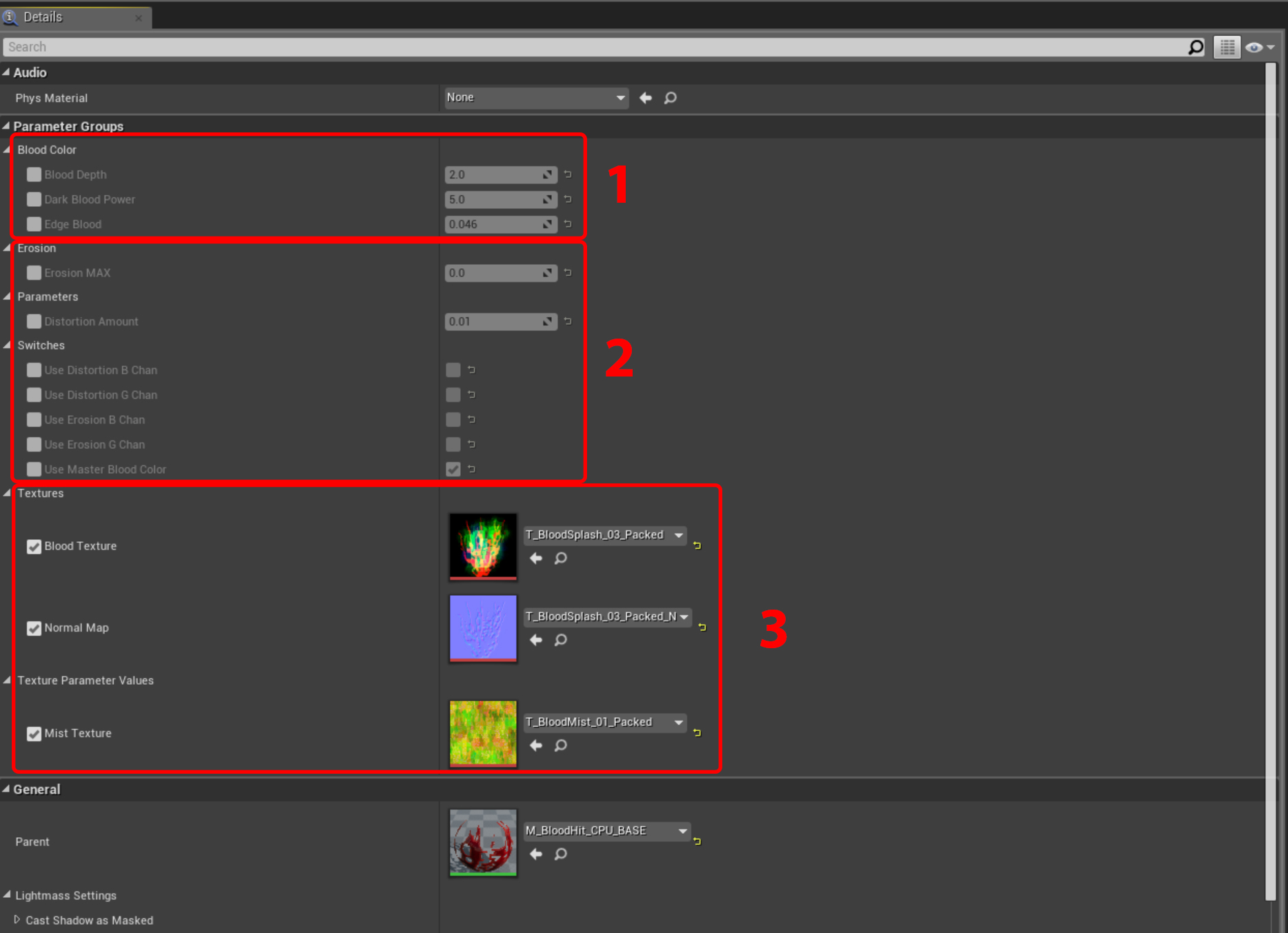To save on texture memory in the particle system it is advantageous to reuse the same texture across Material Instances if possible. For example T_BlodMist_01_Packed can be used on all instances of related materials to one particle system since it has enough versatility in the packed channels. You will see that it is also used in the Blood Drops and additional Blood Hit Materials.