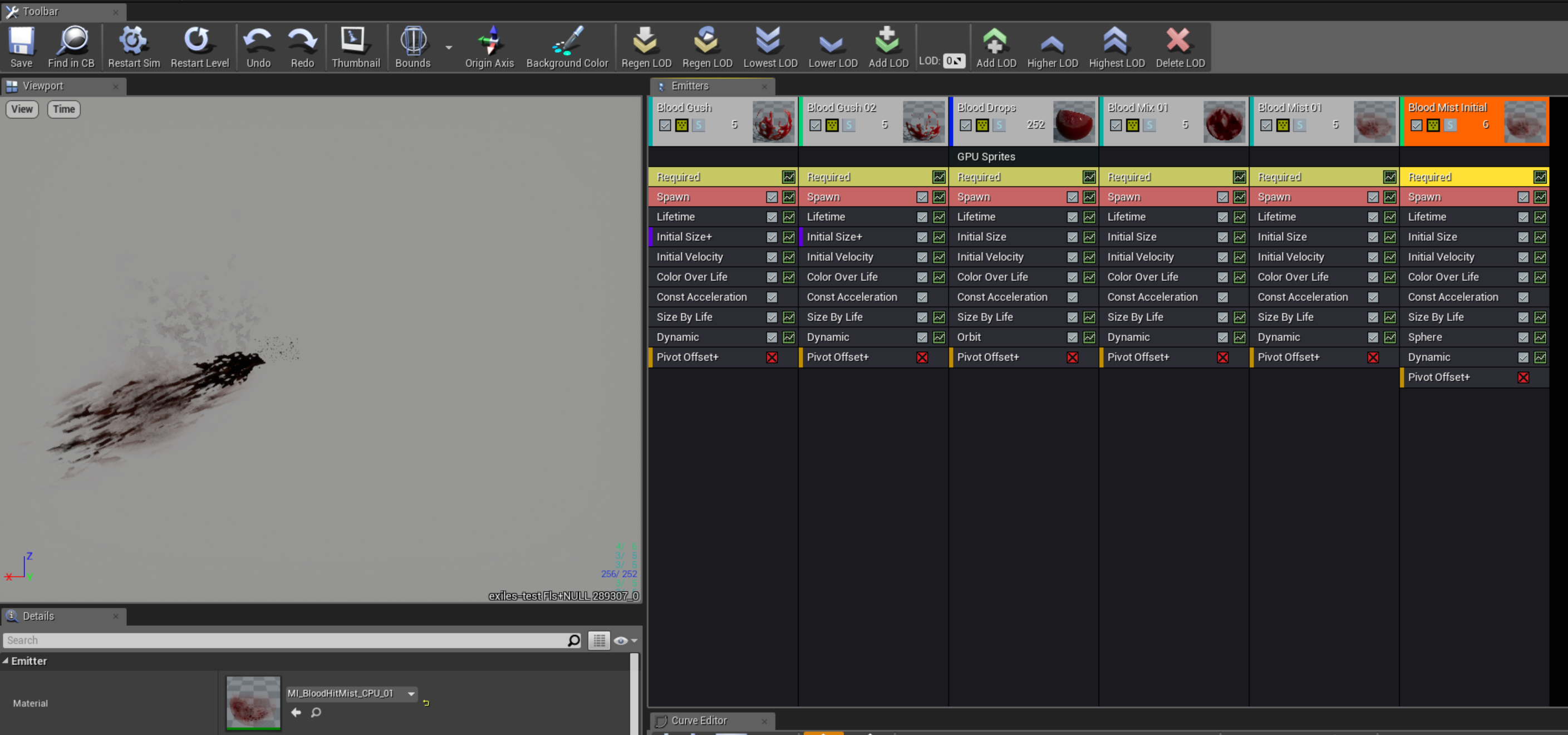 The key to this particle system is how few particles actually spawn and how it utilizes optimized materials and textures. The goal is to have the textures do the heavy lifting so that you need less particles to accomplish having enough blood coverage. The systems is pretty self explanatory, so this section will only briefly describe the LOD setup, overdraw from shader complexity and provide a quick overview.