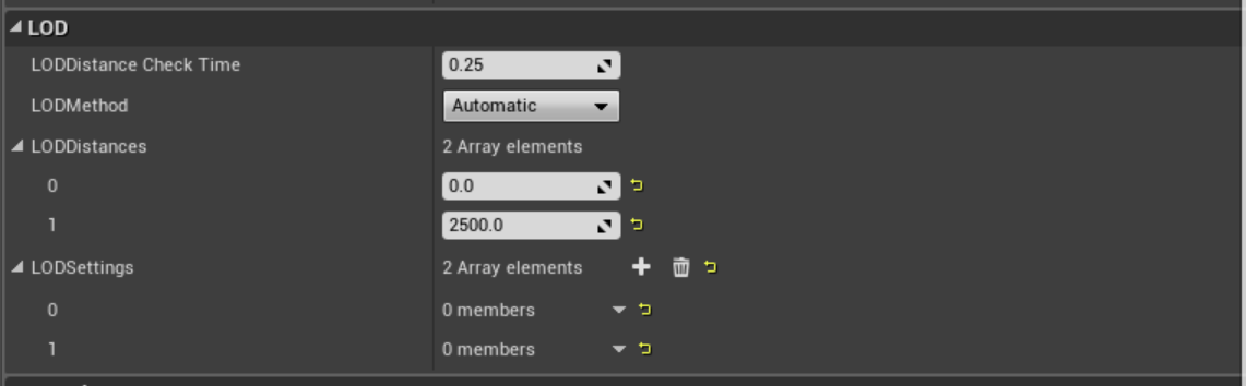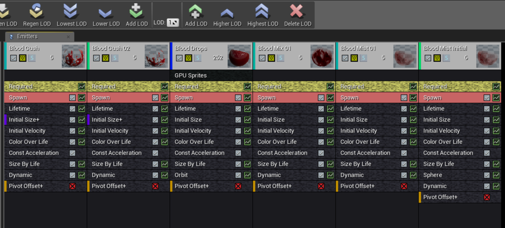 An LOD system has been setup with only LOD0 and LOD1. At LOD one, as indicated below, only the spawn total is affected. The Blood drops are nonexistent and all other emitters only spawn 1 particle. The distance for LOD1 is set to 2500 currently.