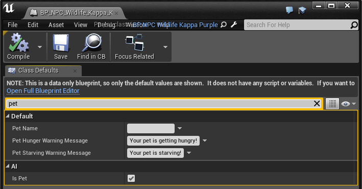 If you have copied an already existing pet blueprint, you don't need to do this, but it may be worth knowing about it. If you filter the blueprint for "pet", you will see something like the following