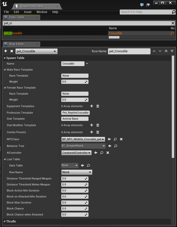 The ThrallDataTable is an important table for our pets - it determines the dietary requirement for the pet, and is the final link to the blueprint. It also cements the thrall component into the pet once it has been converted. Some of the data here is replicated from tables used before this one but do take the time to set it correctly here as well.