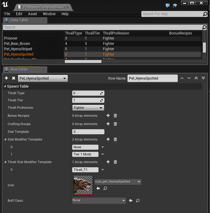Profession Template - This is important because it will link to the profession-table that in turn sets a profession enum on the pet through the ThrallDataTable (more about this later). This entry needs to be unique to the pet.