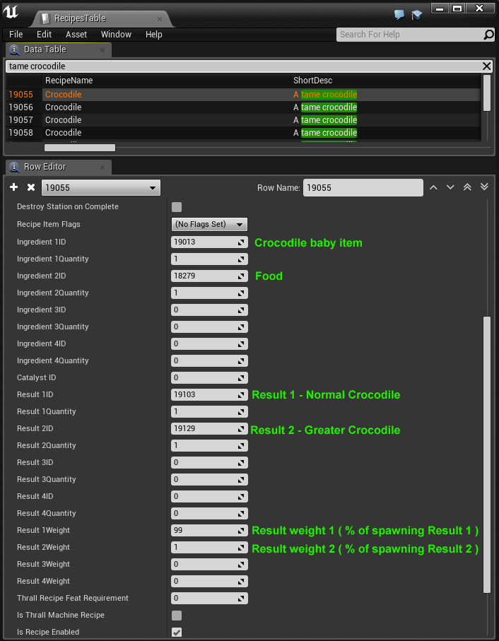 The profession table is required in order to assign a placed thrall a Type. The entry in the item-table for a Crocodile looks like the image on the right.