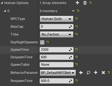 By expanding the Human/Wildlife Options, you get a number of possible setups. The only one you truly need to be aware of here is the "SpawnTable" entry. This is what determines what NPC to spawn in the spawnpoint.