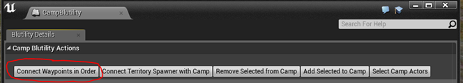 Find the CampBlutility in the Content Browser and open it - this tool allows you to quickly add assets to your camp. Now - mark your entire camp in the world outliner (including the CampOwner and TerritoryManager) and in the blutility click "Connect Territory with Camp" and "Add Selected to Camp".