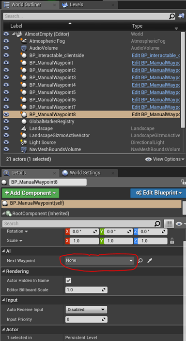 Next, find the /Game/Systems/AI/Navigation/BP_ManualWaypoint blueprint, and drag it into the level where you want the different waypoints to be. Your NPC will traverse in a straight path (if possible) towards each of these, so it may pay to put in quite a few of them unless you want your NPC to run very long straight stretches.