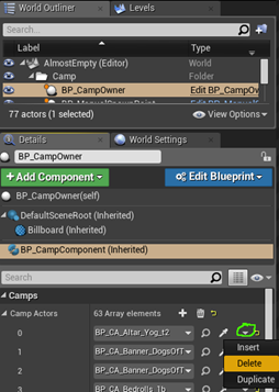 If you need to remove camp assets from the camp owner, the easiest way is to simply delete them from the level, mark your entire camp structure again, and through the blutility click "Add Selected to Camp" again. However - if you (for some reason) don't want to do this - or can't - it's possible to delete individual assets from the CampOwner by accessing the BP_CampComponent, and deleting individual entries in the array.