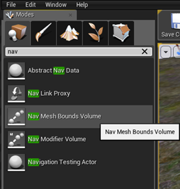 Another issue that may occur is that the Navmesh does not cover your area. In order to correctly place a Navmeshbounds, drag one from the Modes window and scale it up to cover the area that does not have navigation.