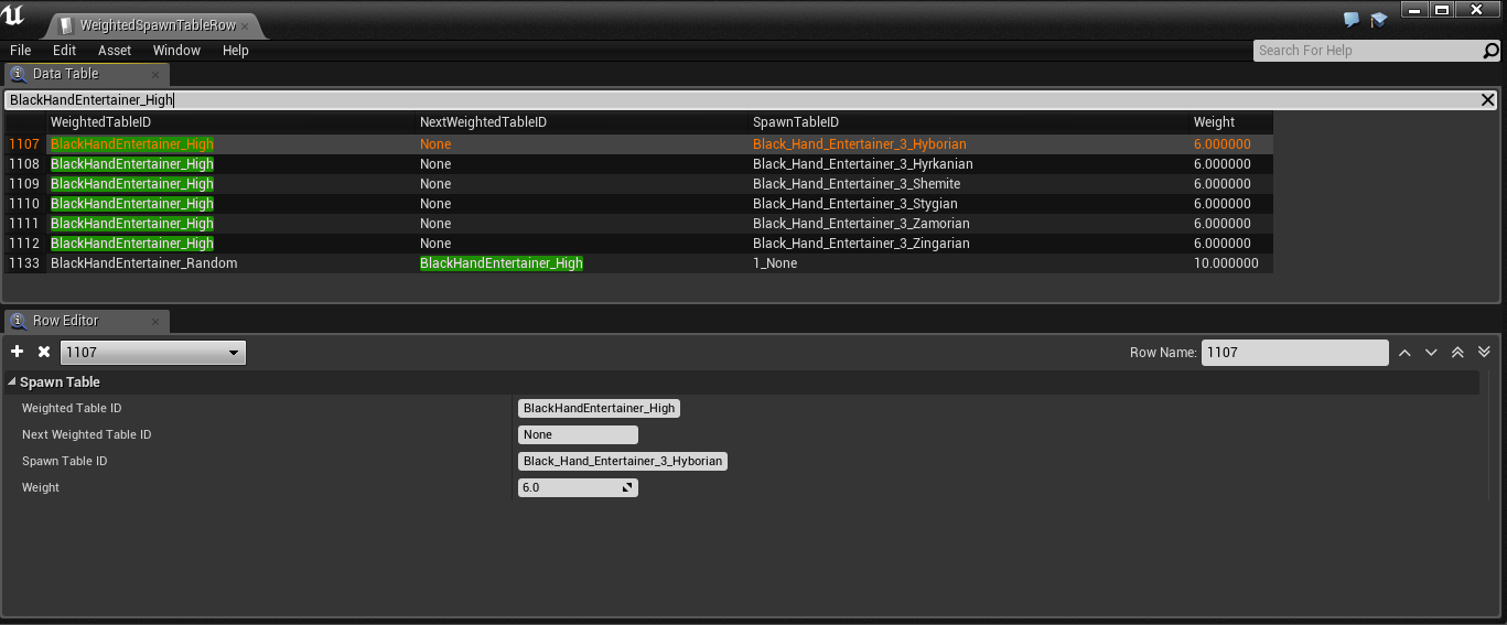 In this example, you can see that there are multiple entries of the "BlackHandEntertainer_High" and that they point to different specific SpawnTableID's. Also note that all these have the exact same weight (6 in this case). This means that there is an equal chance of spawnening either of these entries when the "BlackHandEntertainer_High" is called.