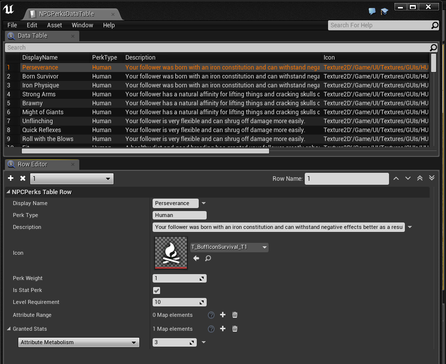 Perk Type is yet another referral entry, in this case it refers to the entry in «NPCPerksDataTable» which determines what type of perk the follower gets, at which level, and the type of bonus it has.