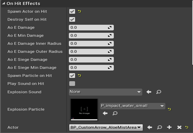 Actor (default "none") is the actor to spawn on arrow impact. This can be further modified to create a number of lingering effects (see below)