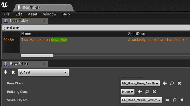 Worth noting is that you should always make a blueprint the child of a pre-existing blueprint. In the example to the right, the basic blueprint is "BP_Base_Visual_Axe2h", and so if we wanted to make a special axe that glows in the dark, we should make a child of this blueprint and add our functionality in that one.