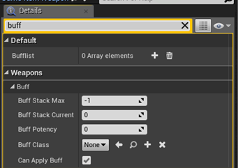 One of the easiest things to add to your weapons are buffs. Searching for "buff" in the Details pane will show you something like the image on the right. So let's go through those entries first.