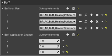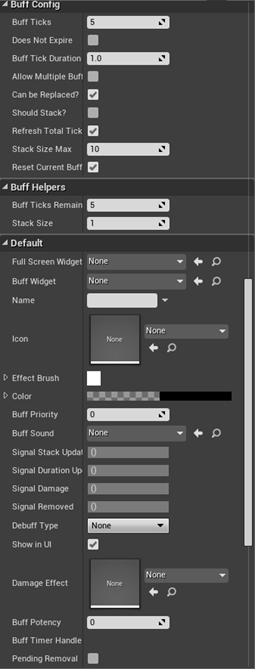 Custom buffs usually have extra setups beyond the ones listed here, but we will go through those later on in the section that talks about stat buffs, poisons and healing. Each of these types of buffs implement slightly different stats in addition to the default ones that are inherited from the 01_BP_AC_Buff_Master blueprint.