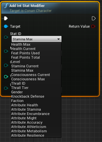 For an example, if you open the buff "BP_AC_Buff_MaxStamina" but if you want to see the list of float stat modifiers instead, use the function "Add Float Stat Modifier".