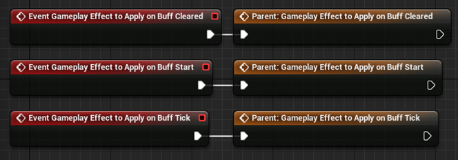 When making custom buffs that have effects on the player beyond the ones listed above, there are some events you should be aware of. Depending on the situation, you may or may not want to also run the parent blueprint functionality or not.