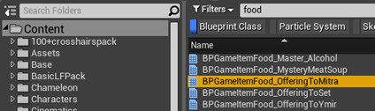 In this guide, we won't go through how to create a food item (although it's very easy - simply copy the stats of one of the existing ones in the ItemTable and create and link it to a new food blueprint - you can use any of the existing ones, for example the BPGameItemFood_OfferingToMitra blueprint).