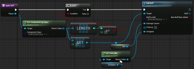 You may want to apply buffs from other sources, such as an area. An good example blueprint that does this is the BP_HazardArea blueprint but in essence, what you need to do is to get the 00_BP_AC_BuffSystemComponent from the player and use that to add a buff (see image below).
