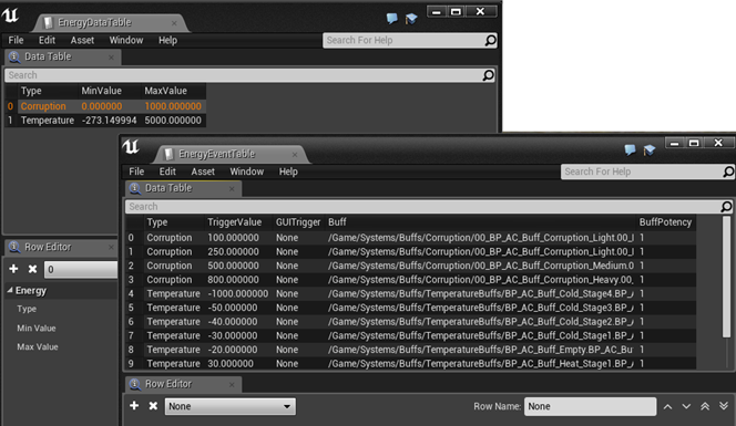 This guide will not go through energy types in detail, but suffice to say that there are two tables - the EnergyDataTable that contains all the different energy types of the game (currently, Temperature and Corruption, as mentioned) - it's possible to add more types to the table, but you will need to implement the application of said energy types yourself.
