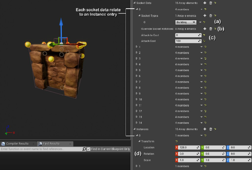 The BuildSockets component in the Components part of the blueprint, unsurprisingly enough, houses all the information about how the Sockets attach to a building piece. You can use the “Instances” list of sockets to find the location and rotation of the socket in the Viewport.