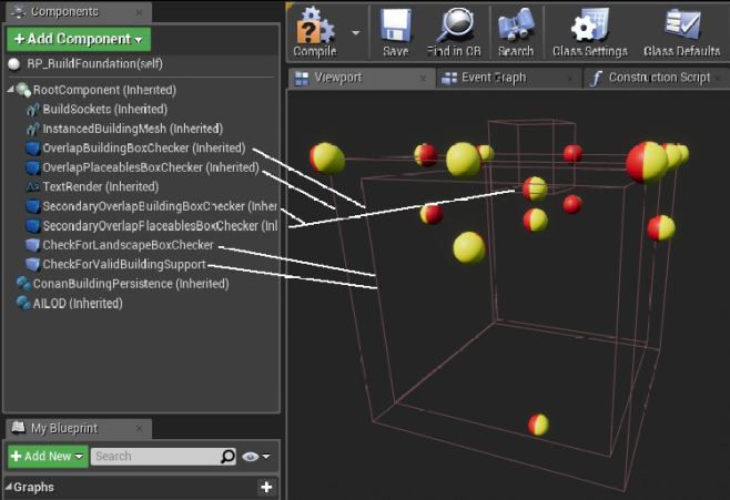 Next, we’ll talk about the overlap boxes in the Foundation blueprint. Each of the boxes is used to check for something specific when the player is attempting to place the building piece in the world.